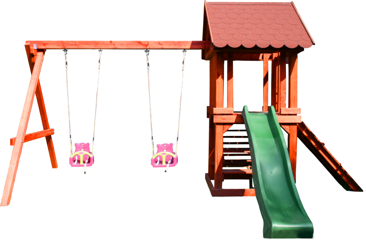 Detalii Constructive și Dotări: Ansamblul include un turnuleț robust, accesibil printr-o scară de lemn solidă. Pentru dezvoltarea abilităților de coordonare, structura este prevăzută cu o platformă pentru cățărare. Acoperișul este realizat din șindrilă bituminoasă Tegola, disponibilă în diverse culori, oferind o protecție superioară împotriva precipitațiilor. La baza turnului, spațiul este optimizat prin integrarea unei zone de relaxare compusă din două băncuțe și o masă, ideală pentru activități creative sau gustări în aer liber.