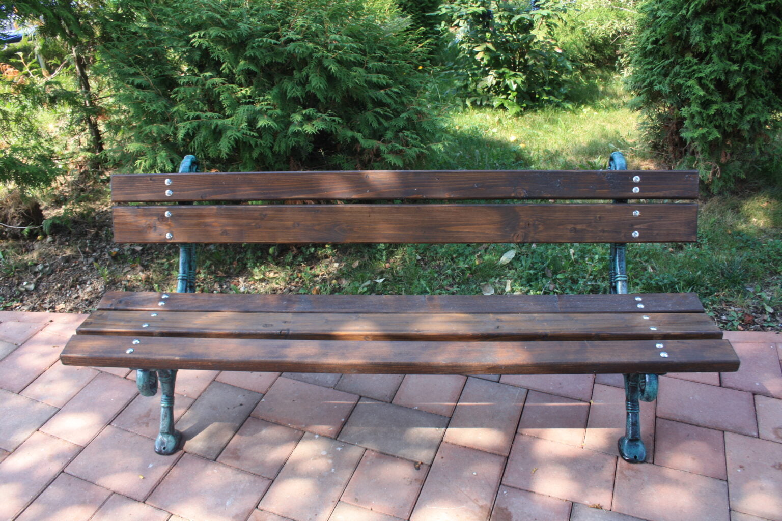 Descriere: Banca cu spatar, schelet metalic (vopsea cu efect de antichizare) si rigle de lemn.